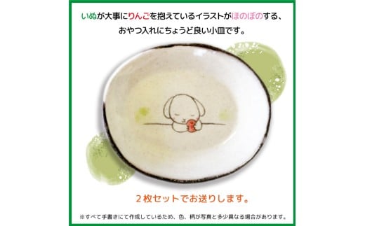 いぬが大事にりんごを抱えているイラストがほのぼのする、おやつ入れにちょうど良い小皿です。