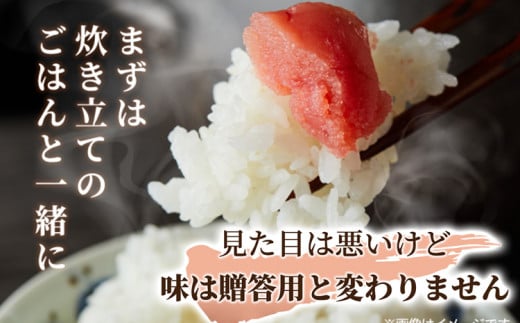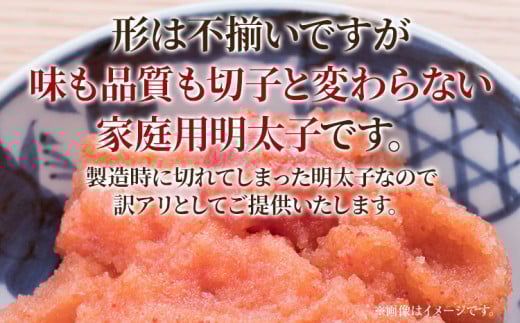 形は不揃いですが、味も品質も切子と変わらない家庭用明太子です。