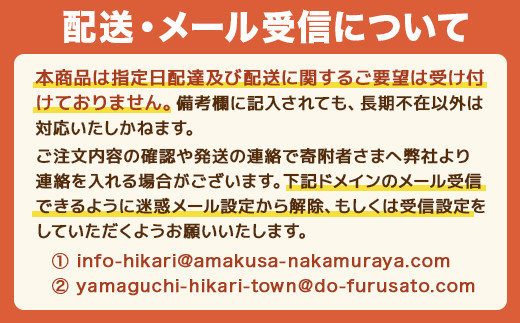 [備考] 受付時間:9:00~17:45(月~金) ※土日・祝日はご対応できかねます。ご了承ください。 ※配送先を変更したい場合 受領証明書等の書類やお礼の品の配送先を変更ご希望の場合、【注文番号・氏名・住所】などの情報と【変更後の情報】をメールや電話にてご連絡ください。 お礼の品の準備状況によっては、対応いたしかねる場合がございますので、その際は、発送後にご自身での転送依頼をお願いする場合もございます。 【※各ポータルサイト内でご住所の変更をされても反映されませんのでご了承ください※】 ▼住所変更時の連絡先 株式会社エフビーネット 050-3619-5724 info-hikari@amakusa-nakamuraya.com ※配送日時指定をされた場合 指定された日付によっては、ご希望に添えない場合がございます。 その場合弊社から最短で発送できる変更内容のメールを配信しますのでご確認下さい。