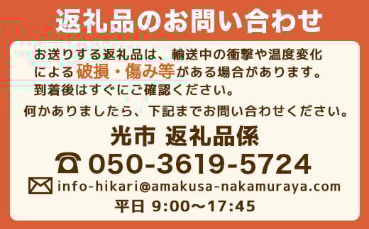 [備考] 受付時間:9:00~17:45(月~金) ※土日・祝日はご対応できかねます。ご了承ください。 ※配送先を変更したい場合 受領証明書等の書類やお礼の品の配送先を変更ご希望の場合、【注文番号・氏名・住所】などの情報と【変更後の情報】をメールや電話にてご連絡ください。 お礼の品の準備状況によっては、対応いたしかねる場合がございますので、その際は、発送後にご自身での転送依頼をお願いする場合もございます。 【※各ポータルサイト内でご住所の変更をされても反映されませんのでご了承ください※】 ▼住所変更時の連絡先 株式会社エフビーネット 050-3619-5724 info-hikari@amakusa-nakamuraya.com ※配送日時指定をされた場合 指定された日付によっては、ご希望に添えない場合がございます。 その場合弊社から最短で発送できる変更内容のメールを配信しますのでご確認下さい。
