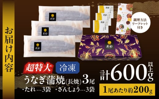 うなぎ蒲焼特大3尾(さんしょう・たれ付き)計600g以上 鰻 魚 魚介 加工品 国産_T026-0021