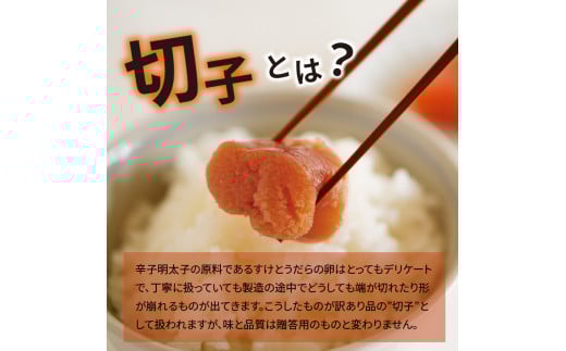辛子明太子の原料であるすけとうだらの卵はとってもデリケートで、丁寧に扱っていても製造の途中でどうしても端が切れたり形が崩れるものが出てきます。こうしたものが訳あり品の”切子”として扱われますが、多少形がくずれてしまっても味と品質は贈答用のものと変わりません。