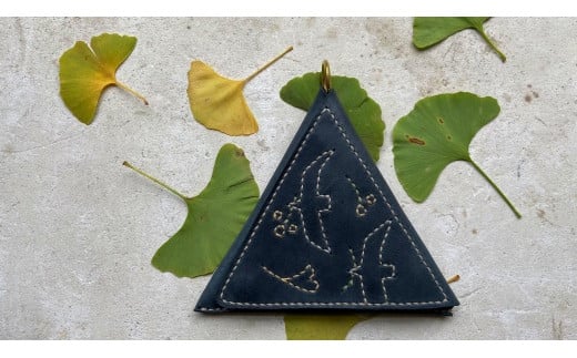 鳥とイチョウの三角のケース (ネイビー)| いちょう 紺 小物入れ おしゃれ 贈答用 ハンドメイド 送料無料 東京 八王子