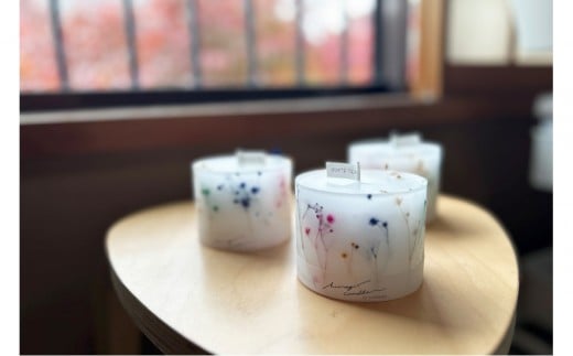 パラフィンワックス、マイクロソフトワックス、ステアリン酸、香料、綿芯、花材