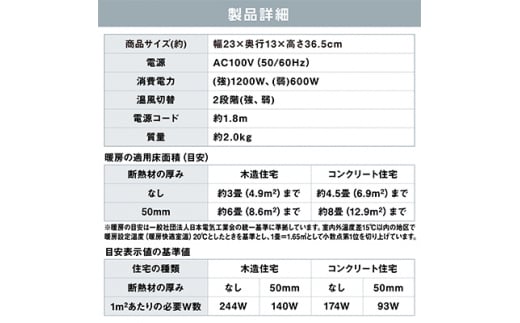 ●消費電力(50/60Hz):送風15W、弱600W、強1200W