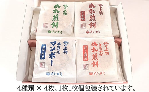 千葉県 銚子市 名産 ぬれせんべい 詰合せ 16枚 4種 各4枚 ぬれ煎餅 ぬれ煎餅 濃い口 うす味 ぬれてるマンボー まろやかぬれ煎餅 せんべい 煎餅 国産 うるち 米 あられ おかき おつまみ おやつ 和菓子 お土産 贈答用 贈答 ギフト プレゼント 送料無料 せんべい 煎餅 銘菓 イシガミ