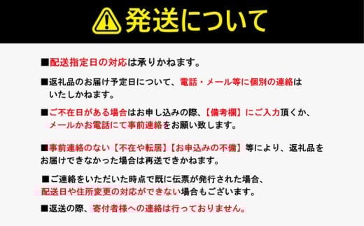 ※寄附者様のご都合(長期不在および住所・配送先変更等)により、謝礼品のお受取りできなかった場合や受取りまでに期間がかかった場合などは、再発送・転送はできませんので、予めご了承ください。