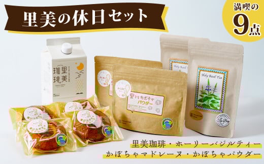 里美の休日セット(ホーリーバジルティー 2パック+里川カボチャのパウダー 2パック+里川カボチャのマドレーヌ 4個+里美珈琲1,000ml 1本)【アイスコーヒー コーヒー カフェオレ 牛乳 カフェ 豆 ブレンド 焙煎 コク ハーブ お茶 紅茶 バジル 爽やか ティー ミント ハーブティー ティーバッグ リフレッシュ ストレス緩和 免疫力 無農薬 茨城県 常陸太田市】
