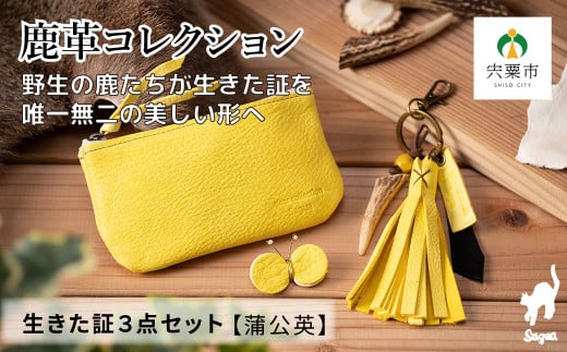 AN15  鹿革コレクション「生きた証」蒲公英 3点セット 【 ポーチ タッセル チャーム 鹿革 革製品 小物入れ 小銭入れ カードサイズ オーガニック 蝶 チョウ 手作り タンポポ たんぽぽ 黄色 イエロー 】