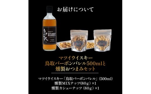 マツイウイスキー鳥取バーボンバレル(500ml)、燻製MIXナッツ(80g)×1、燻製カシューナッツ(80g)×1