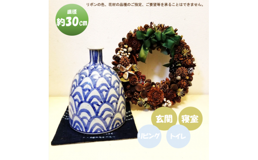 八ヶ岳南麓の木の実や花の殻などを使ったリース。赤と緑のリボンは付け替えできます。
