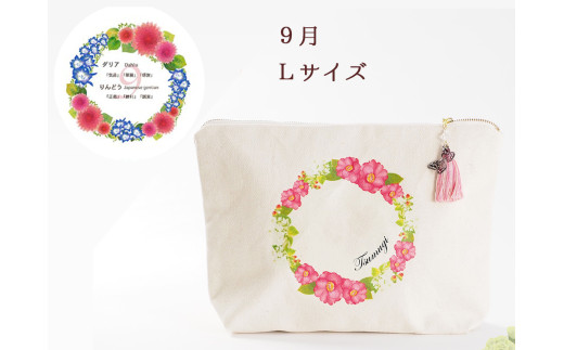 9月【名入れオーダー】ブルミア 誕生花が咲き続けるポーチ Lサイズ チャーム付き