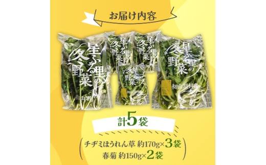 <北海道 初山別村>冬野菜詰め合わせ5袋(チヂミほうれん草×3袋・春菊×2袋)【1665017】
