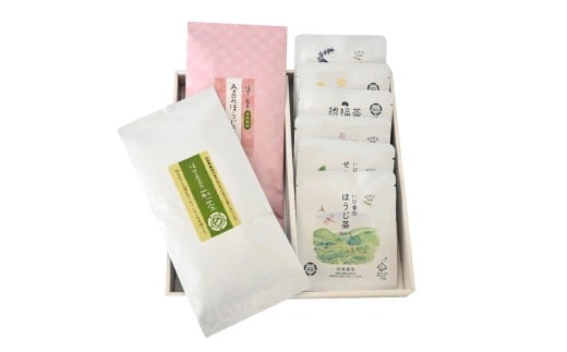 煎茶とほうじ茶の茶葉と、日本茶フレーバードティーのプチパックのセットです。