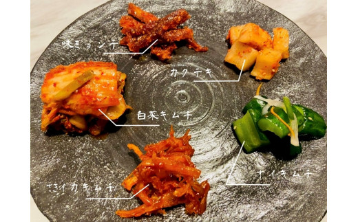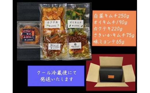 自家製 キムチ 5種セット【白菜キムチ、オイキムチ、カクテキ、さきいかキムチ、味ミョンテ(さきタラの甘辛和え)】[0485]