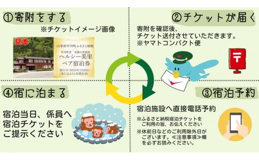 ヘルシー美里へご宿泊お申込みの上、本チケットの使用の旨をお伝えください。