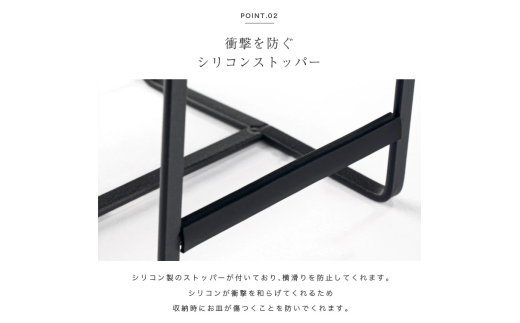 お皿を支えるバーにはシリコン製のストッパー付きなので、収納時のお皿の横滑りや衝撃を和らげてくれます。