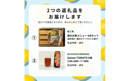 7. 島のお魚メニュー 4点セット / 大崎上島のクラフトビール Saison TOMATO 6本 西京漬け 鯛のオリーブオイル漬け 星と陽のひとしほ レモン 檸檬 瀬戸内レモン クラフトビール 地ビール 爽快 ホップ 晩酌 国産 瀬戸内 広島 離島 セット