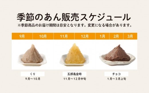 受付はチョコレートあん1月~2月中旬、くりあん9月~10月上旬、芋きんとん11月~12月上旬