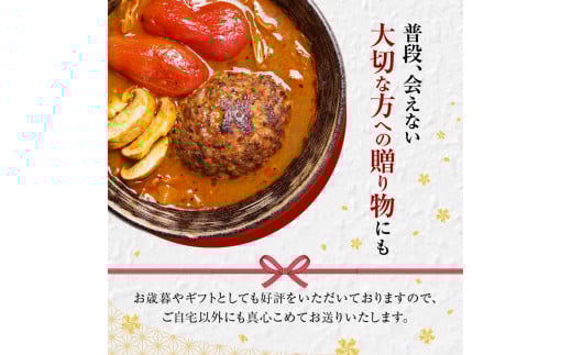 ハンバーグ(牛肉、玉ねぎ、液卵、その他)、海老だし(甘えび頭、キャベツ))、キャベツ、ミックスチーズ、ブロッコリー、スープベース、スープカレー調味料、ほうれん草、香辛料、ガーリックオイル、みりん、食用動物油脂、生クリーム、コンソメ、ブイヨン/セルロース、酸味料、調味料(アミノ酸等)、カラメル色素、(一部にえび・小麦・卵・乳成分・牛肉・ごま、大豆・鶏肉・豚肉を含む)