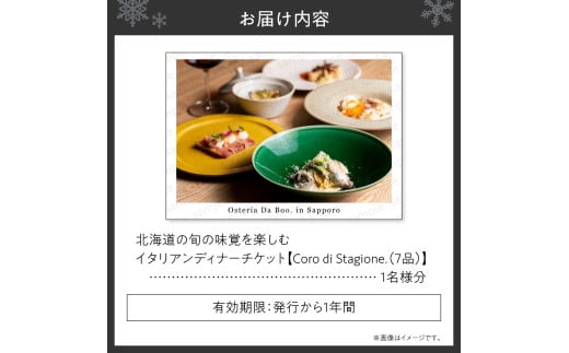 ■関連キーワード:お食事券 1名様分 イタリアン ディナー 北海道産 食材 7品 コース Coro di Stagione. イタリア料理 食事 利用券 チケット お一人様 ご褒美 北海道 札幌市