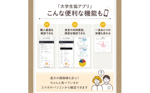 ・遠方の親御様も利用履歴をご覧いただけ、学生生活を見守ることができ、安心です。