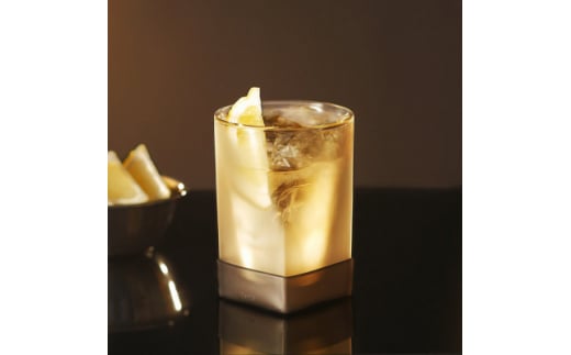 そして、飲み口は円形で底面に下がるにつれスクエア形状のグラスをデザインしました。スクエアデザインは、見る角度によって変わるさまざまな表情をたのしめ、置いたときの安定感が向上し、手で持つ際のグリップ力を高めてくれます。