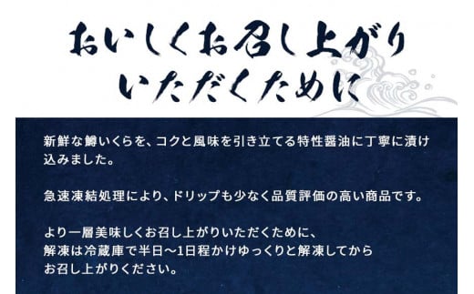 そんな新鮮な鱒いくらを、コクと風味を引き立てる特性醤油に丁寧に漬け込みました。急速冷凍処理により、ドリップも少なく品質評価の高い商品です。