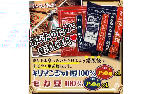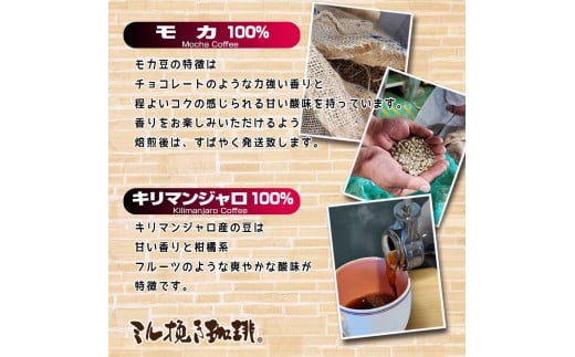 ミル挽き珈琲 モカ豆100% 1袋・キリマンジャロ豆100% 1袋セット (250g/袋)