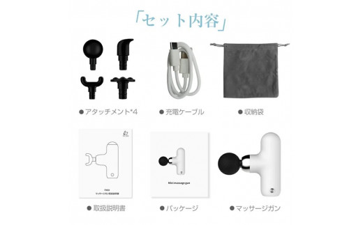 マッサージガン本体、アタッチメント、充電ケーブル、収納袋、日本語取扱説明書