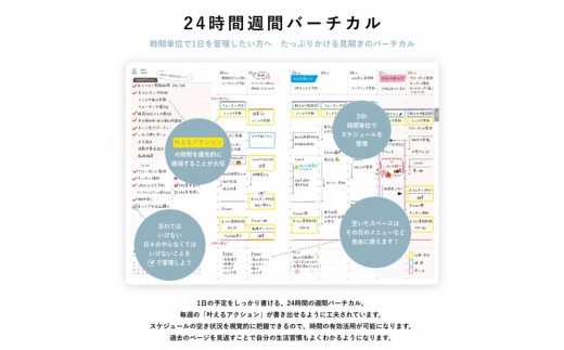 【内容】年間スケジュール、マンスリー(六曜あり・月齢あり)、ガントチャート、自分年表、なりたい自分リスト、理想の自分サークル、やらない事リスト、叶えるアクション欄付き24時間週間バーチカル、メモ、ペンホルダー、しおり紐3本