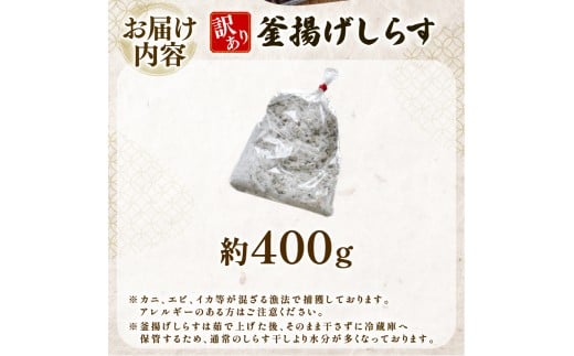 訳あり 釜揚げしらす 約400g 冷凍 惣菜 弁当 晩ごはん 白州 魚介類 海鮮 わけあり 小魚 鮮魚 グルメ 人気 海の幸 ふりかけ ちりめん しらすご飯 国産 じゃこ しらす丼 塩分控えめ 減塩 離乳食 おにぎり パスタ カニ エビ イカ 稚魚 海藻 保存方法 解凍方法 レシピ アレンジ 簡単 便利 おいしい 安心 安全 旨味 塩分 おつまみ 高知県 安芸市