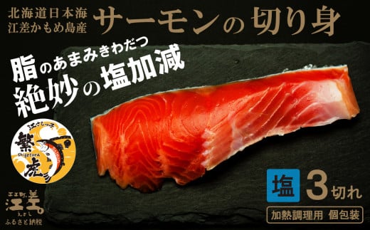 北海道産 サーモンの切り身[塩]3切れ 加熱調理用 日本海 かもめ島海面養殖 純国産 ブランドサーモン『江さしっ子 繁虎』 とろける脂 活締め 浜のかあさん手作り 冷凍 小分け 個包装 トラウトサーモン 塩鮭 焼き鮭 海鮮 鮭 さけ シャケ しゃけ さーもん 焼き魚 保存料不使用