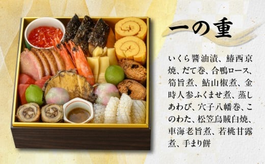 栗きんとん、ローストビーフ山椒仕立て、かまぼこ、胡桃甘露煮、帆立焼、黒豆煮、数の子西京漬、龍飛巻(りゅうひ巻)、蛸足煮、からすみ、車海老旨煮、若桃甘露煮、手まり餅