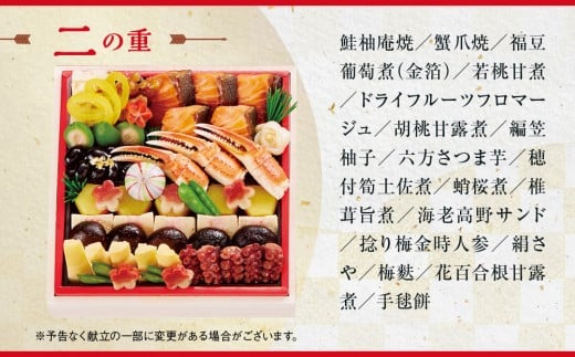 鮭柚庵焼/蟹爪焼/福豆葡萄煮(金箔)/若桃甘煮/ドライフルーツフロマージュ/胡桃甘露煮/編笠柚子/六方さつま芋/穂付筍土佐煮/蛸桜煮/椎茸旨煮/海老高野サンド/捻り梅金時人参/絹さや/梅麩/花百合根甘露煮/手毬餅