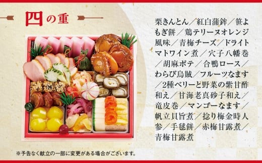 栗きんとん/紅白蒲鉾/笹よもぎ餅/鶏テリーヌオレンジ風味/青梅チーズ/ドライトマトワイン煮/穴子八幡巻/胡麻ポテ/合鴨ロース/わらび烏賊/フルーツなます/2種ベリーと野菜の紫甘酢和え/甘海老真砂子和え/竜皮巻/マンゴーなます/帆立貝旨煮/捻り梅金時人参/手毬餅/赤梅甘露煮/青梅甘露煮