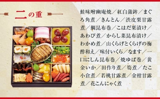 鮭味噌幽庵焼/紅白蒲鉾/まぐろ角煮/きんとん/渋皮栗甘露煮/鯛昆布巻/こはだ粟漬け/あわび煮/からし菜昆布漬け/わかめ煮/山くらげとくらげの梅酢和え/味付いくら/なます/一口にしん昆布巻/焼ゆば巻/黄金いか/田作り煮/筍煮/たこ小倉煮/若桃甘露煮/金柑甘露煮/花こんにゃく煮