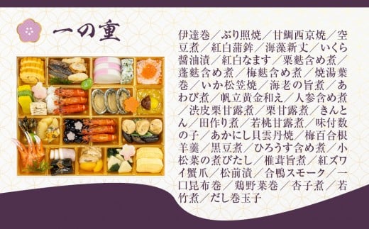伊達巻/ぶり照焼/甘鯛西京焼/空豆煮/紅白蒲鉾/海藻新丈/いくら醤油漬/紅白なます/粟麩含め煮/蓬麩含め煮/梅麩含め煮/焼湯葉巻/いか松笠焼/海老の旨煮/あわび煮/帆立黄金和え/人参含め煮/渋皮栗甘露煮/栗甘露煮/きんとん/一口昆布巻/味付数の子/あかにし貝雲丹焼/梅百合根羊羹/黒豆煮/ひろうす含め煮/小松菜の煮びたし/椎茸旨煮/紅ズワイ蟹爪/松前漬/合鴨スモーク/田作り煮/若桃甘露煮/鶏野菜巻/杏子煮/若竹煮/だし巻玉子