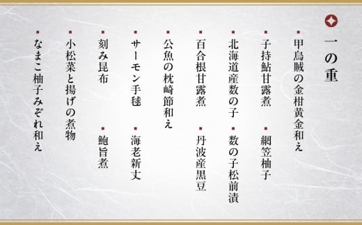 甲烏賊の金柑黄金和え、子持鮎甘露煮、網笠柚子、北海道産数の子、数の子松前漬、百合根甘露煮、丹波産黒豆、公魚の枕崎節和え、サーモン手毬、海老新丈、刻み昆布、鮑旨煮、小松菜と揚げの煮物、なまこ柚子みぞれ和え