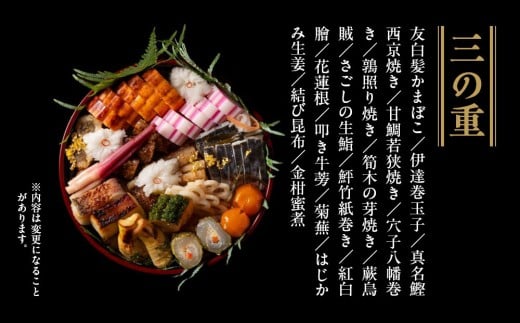友白髪かまぼこ、伊達巻玉子、真名鰹西京焼き、甘鯛若狭焼き、穴子八幡巻き、鶉照り焼き、筍木の芽焼き、蕨烏賊、さごしの生鮨、鮃竹紙巻き、紅白膾、花蓮根、叩き牛蒡、菊蕪、はじかみ生姜、結び昆布、金柑蜜煮