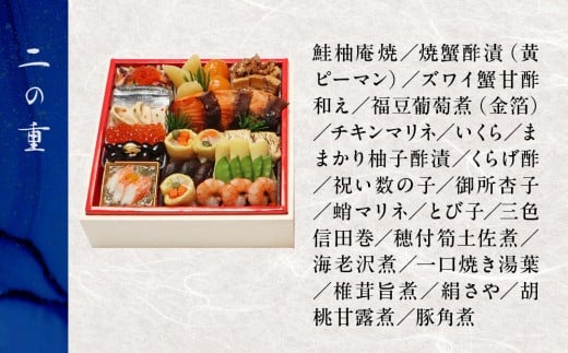 鮭柚庵焼、焼蟹酢漬(黄ピーマン)、ズワイ蟹甘酢和え、福豆葡萄煮(金箔)、チキンマリネ、いくら、ままかり柚子酢漬、くらげ酢、祝い数の子、御所杏子、蛸マリネ、とび子、三色信田巻、穂付筍土佐煮、海老沢煮、一口焼き湯葉、椎茸旨煮、絹さや、胡桃甘露煮、豚角煮
