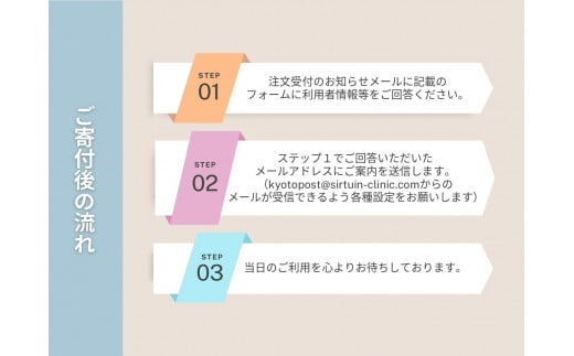 寄付完了メールに記載のフォームより、各質問にご回答ください。ご回答後、ご案内のメールを送信します。 (kyoto@sirtuin-clinic.comからの メールが受信できるよう各種設定をお願いします。)※年末のお申込みは1/8以降のご連絡になる可能性がございます。