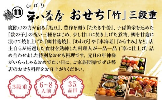 【山ばな平八茶屋】おせち「竹」三段重 6~8人前 | 京都 老舗料亭 本格おせち 人気おせち[ 料亭おせち三段 豪華 美食 グルメ おいしい 大人数 6人 7人 8人 人気 おすすめ 2026 正月 お祝い お取り寄せ 通販 送料無料 年内配送 ふるさと納税 ]