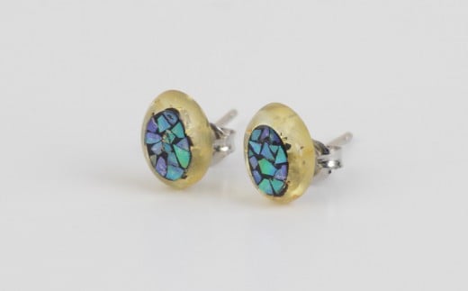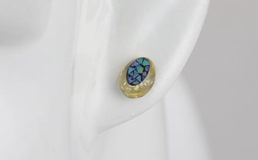 こぶりな琥珀に細かい破片のあわび貝を敷き詰めた螺鈿ピアス
