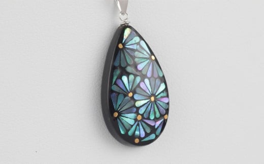 しずく型のベースに菊を隙間なく埋めた螺鈿ネックレス