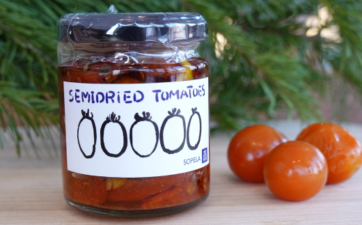 「セミドライトマトオイル漬け」は、規格外トマトを加工品として使い、「丹精こめて育てた野菜を破棄せず、生かしきる」ことを目的として製作しています。ミニトマト「アイコ」をセミドライにして旨み(甘み・酸味)を引き出し、良質なオリーブオイルとハーブでオイル漬けにしました。