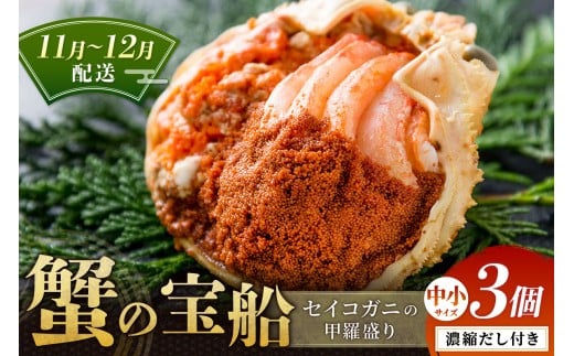 【蟹の匠 魚政】セイコガニの甲羅盛り 蟹の宝船(たからぶね)中小サイズ3個セット 濃縮ダシ付(11月~12月発送) UO01239