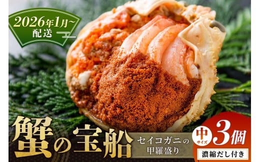 【蟹の匠 魚政】セイコガニの甲羅盛り 蟹の宝船(たからぶね)中サイズ3個セット 濃縮ダシ付(2026年1月~発送) UO01242