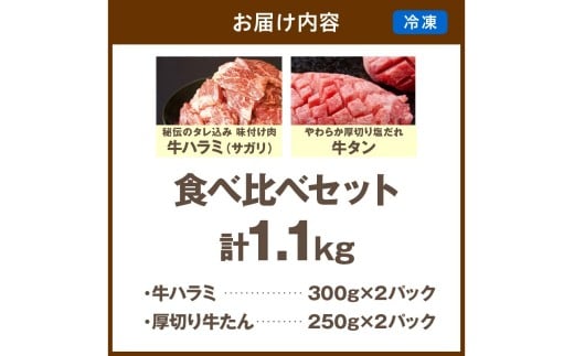 【訳あり】牛ハラミ(サガリ) 秘伝のタレ込み 味付け肉&やわらか厚切り 塩だれ牛タン 食べ比べセット 計1.1kg(2026年1月上旬~発送) YK00475