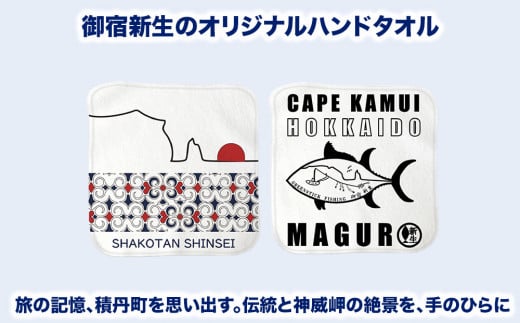 積丹 新生オリジナルハンドタオル ハンカチ(神威岬×アイヌ柄)(1本釣りマグロ)各1枚 積丹2枚セット!!